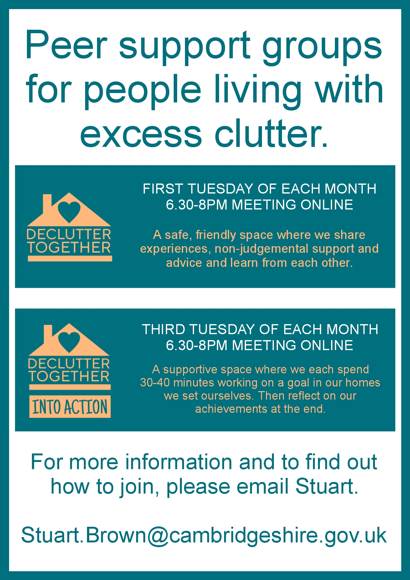 Both the Declutter Together groups are facilitated by Stuart Brown. Stuart is a professional who has lived experience of excess clutter. If you are interested in joining email [email protected] and Stuart will send you the Microsoft Teams link. Note that if you would like to access the meetings on a smart phone you will need to have the Teams app installed.